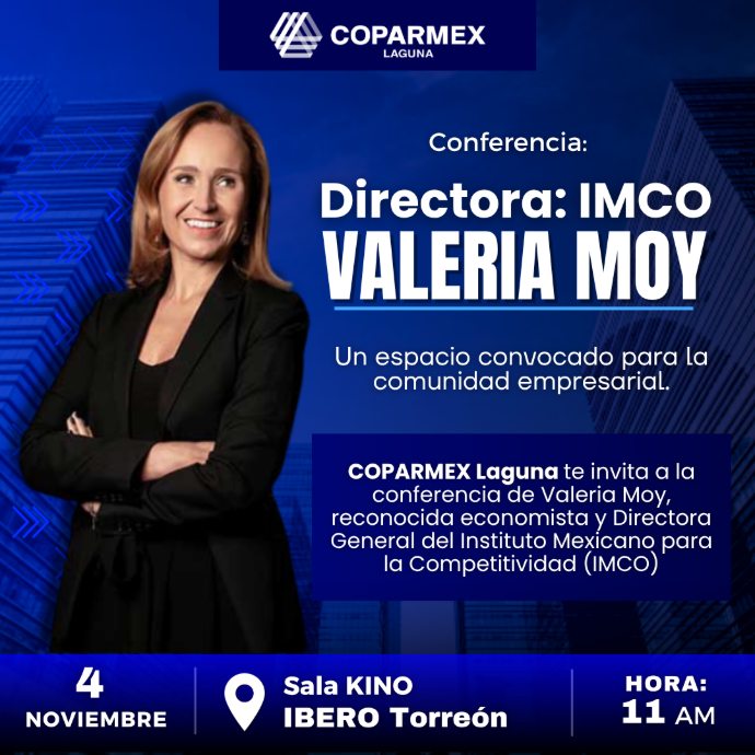 COPARMEX Laguna te invita a la conferencia de Valeria Moy, Directora General del Instituto Mexicano para la Competitividad (IMCO).