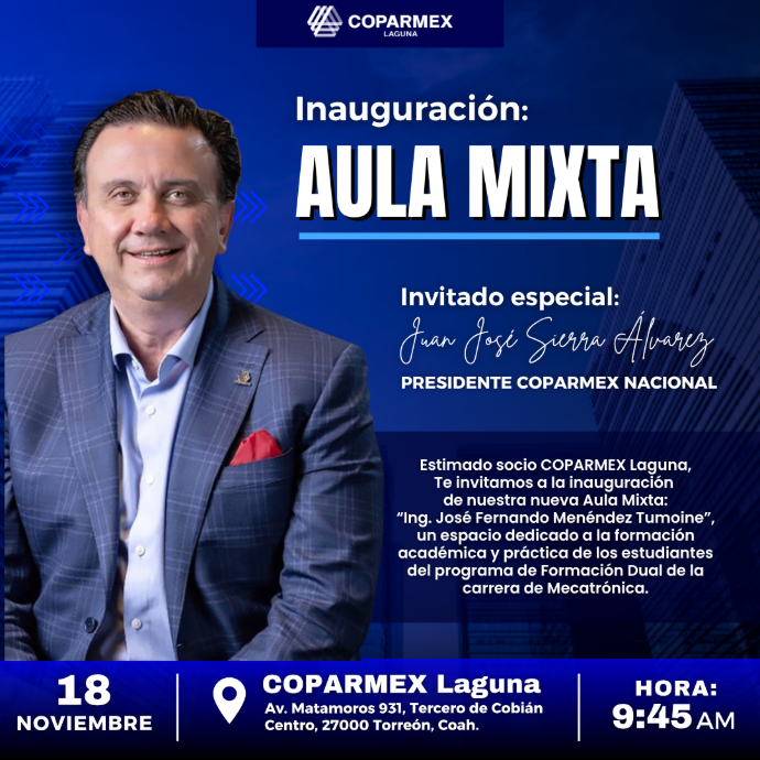 Estimado socio COPARMEX Laguna, Te invitamos a la inauguración de nuestra nueva Aula Mixta “Ing. José Fernando Menéndez Tumoine”, un espacio dedicado a la formación académica y práctica de los estudiantes del programa de Formación Dual de la carrera de Mecatrónica.