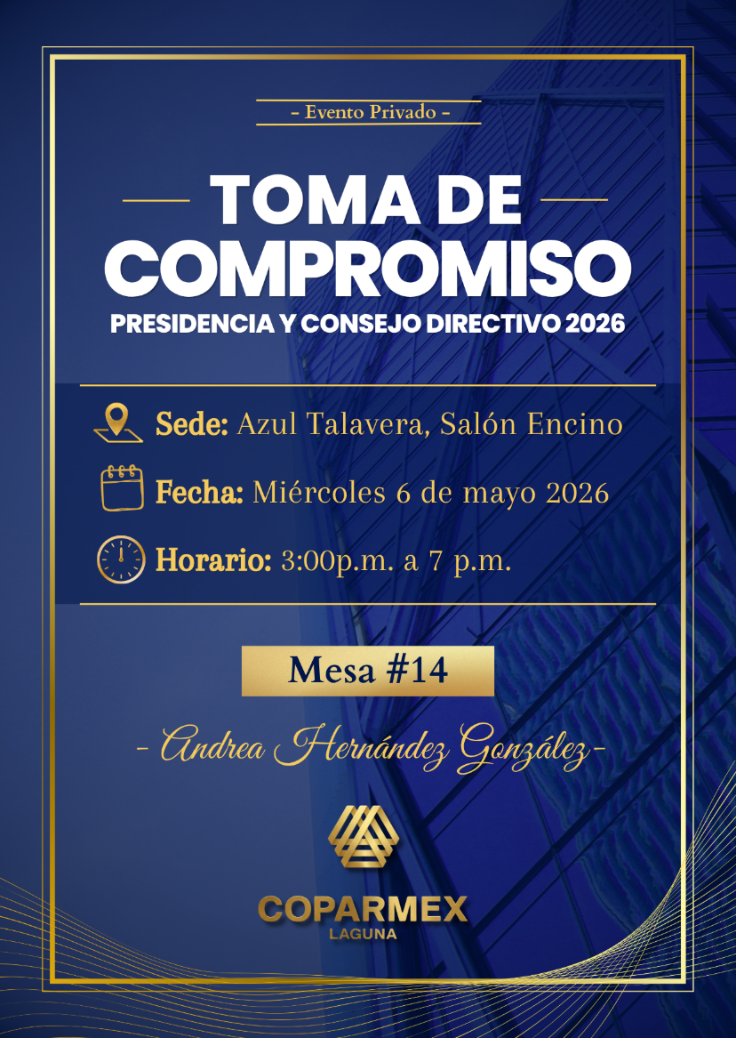 Será un honor contar con su presencia en la Toma de Compromiso de la Presidenta María del Carmen Reyes García y su Consejo Directivo 2026 -2027, un acto que marca el inicio de una nueva etapa de liderazgo y compromiso con el desarrollo empresarial de nuestra región.