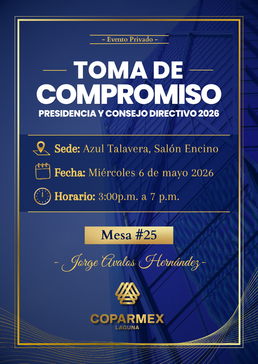 Será un honor contar con su presencia en la Toma de Compromiso de la Presidenta María del Carmen Reyes García y su Consejo Directivo 2026 -2027, un acto que marca el inicio de una nueva etapa de liderazgo y compromiso con el desarrollo empresarial de nuestra región.