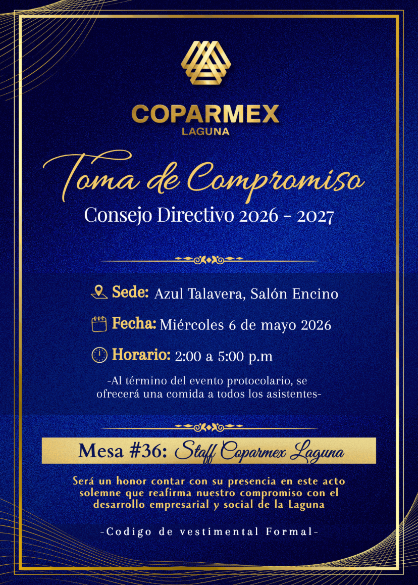 Será un honor contar con su presencia en la Toma de Compromiso de la Presidenta María del Carmen Reyes García y su Consejo Directivo 2026 -2027, un acto que marca el inicio de una nueva etapa de liderazgo y compromiso con el desarrollo empresarial de nuestra región.